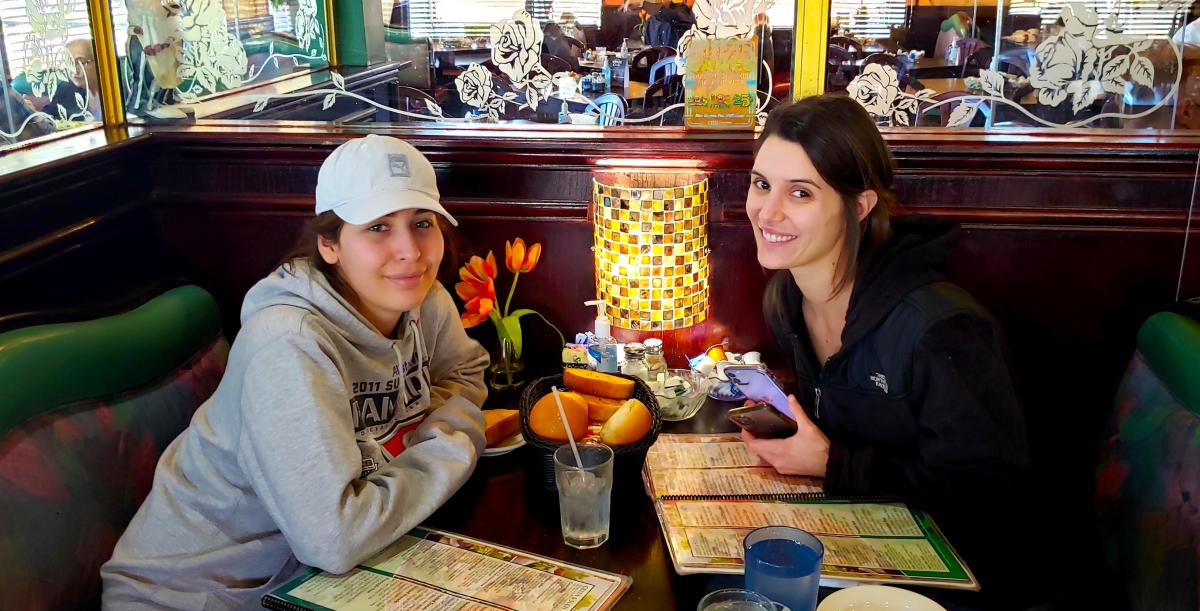 Father and son enjoying breakfast at Annie's Pancake House in Skokie