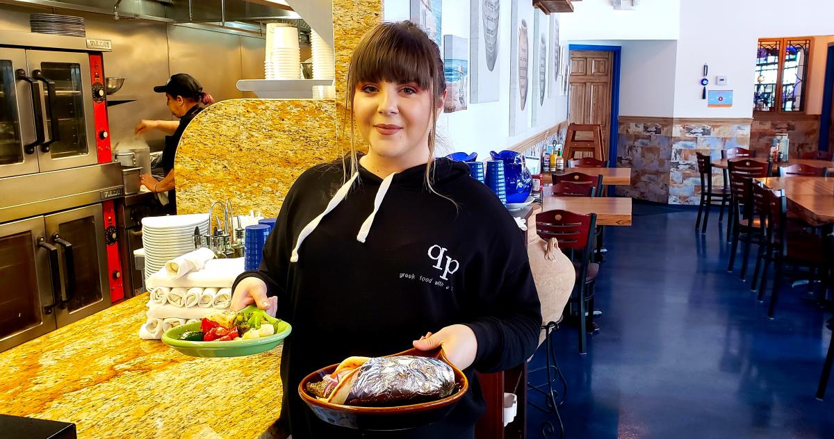 Friendly server at QP Greek Food With a Kick in Hoffman Estates