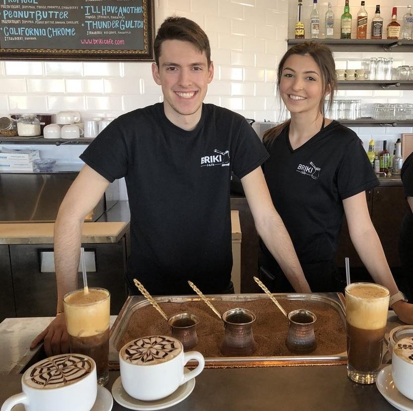 Friendly servers with Greek coffee & frappe at Briki Cafe in Addison