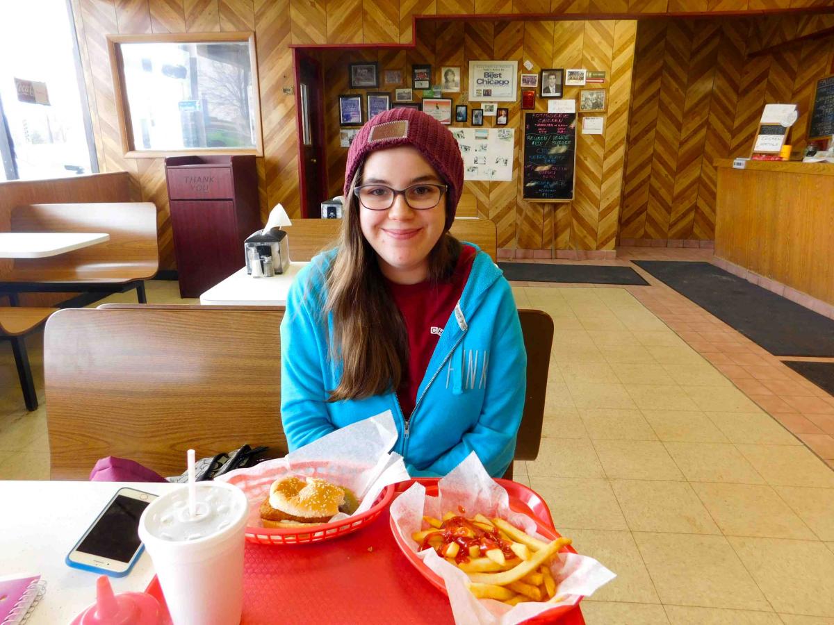 Happy customer enjoying lunch at Nick's Drive In Restaurant in Chicago