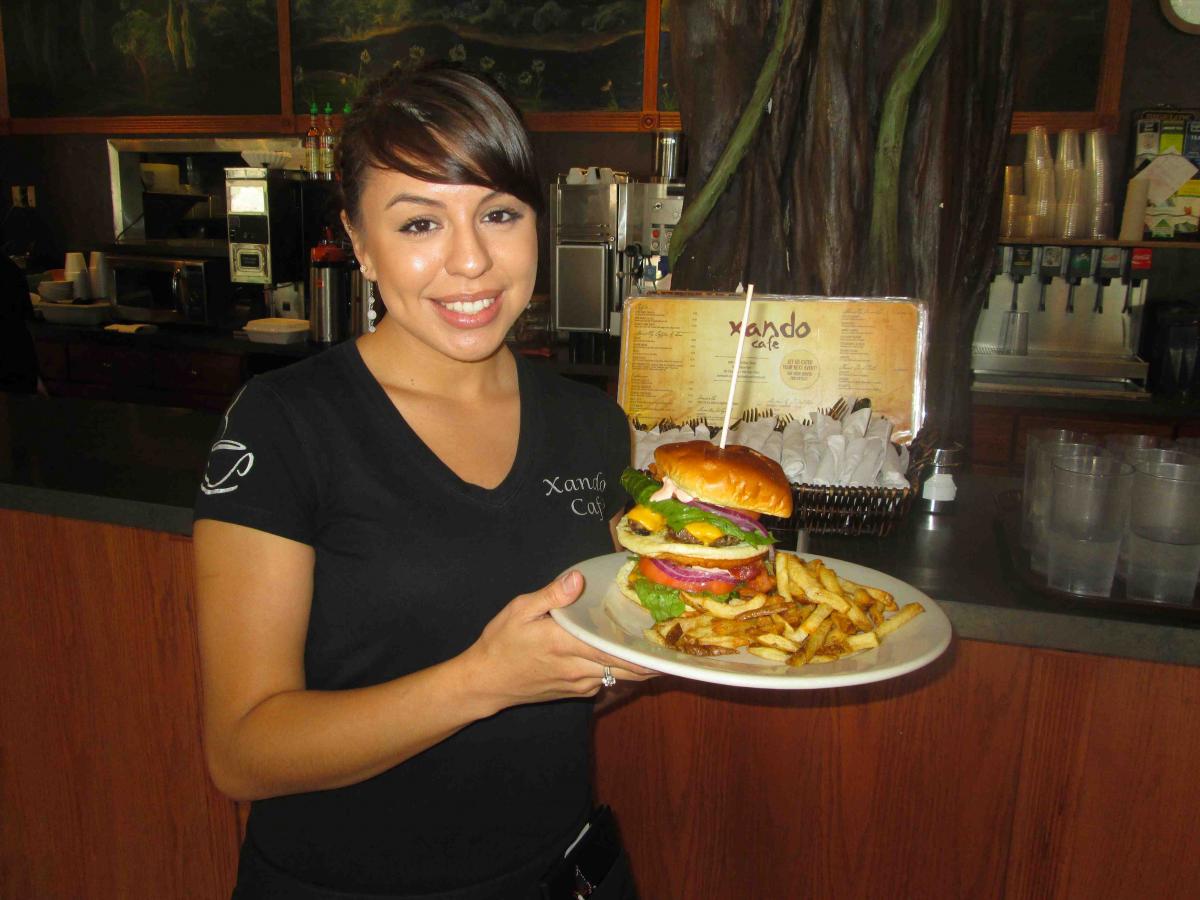 Friendly staff serving the classic burger at Xando Cafe in Hickory Hills